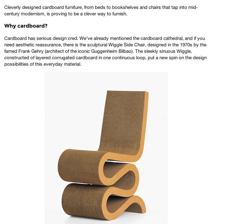 Cardboard comes out of the shadows and into the limelight in some clever, quirky, on-trend furnishings that give a whole new meaning to ‘out of the box’. Frank Gehry’s Wiggle chair is witty and iconic. Some of the other pieces are just very practical (a double bed) and some are a little kooky (a cardboard cat). And cheap! Sustainable, flat-pack – and fun.