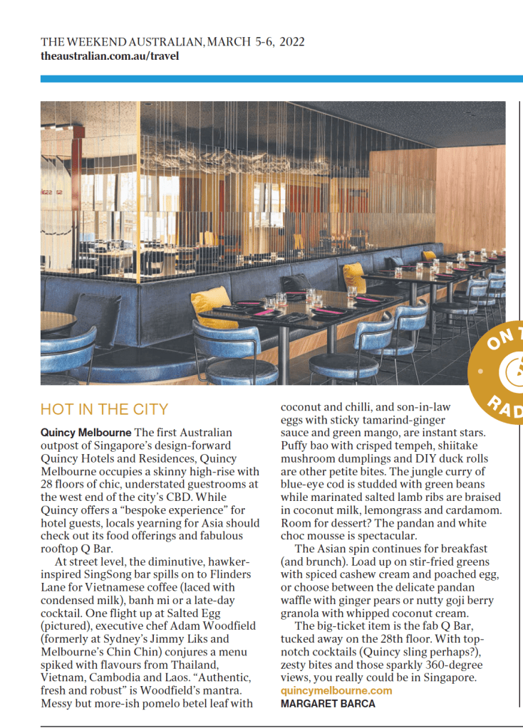 It was a pleasure to review the cool and just-a-little quirky Quincy Hotel, from its street-level cafe to its fab roof-top bar, The Australian’s Travel + Luxury.