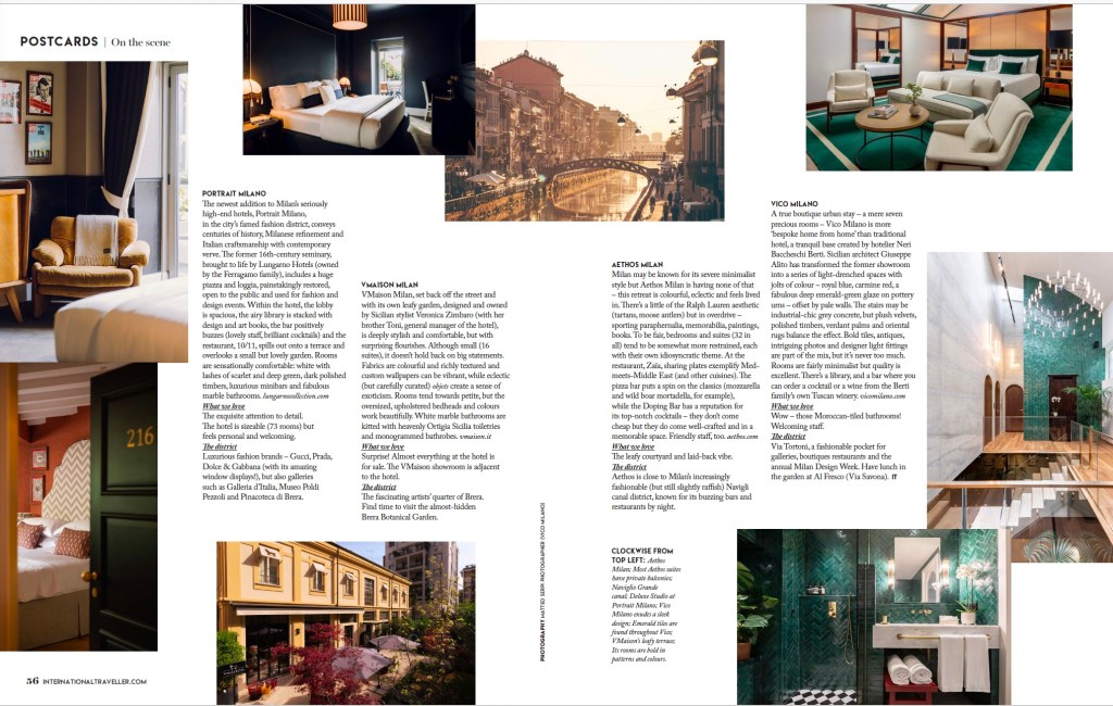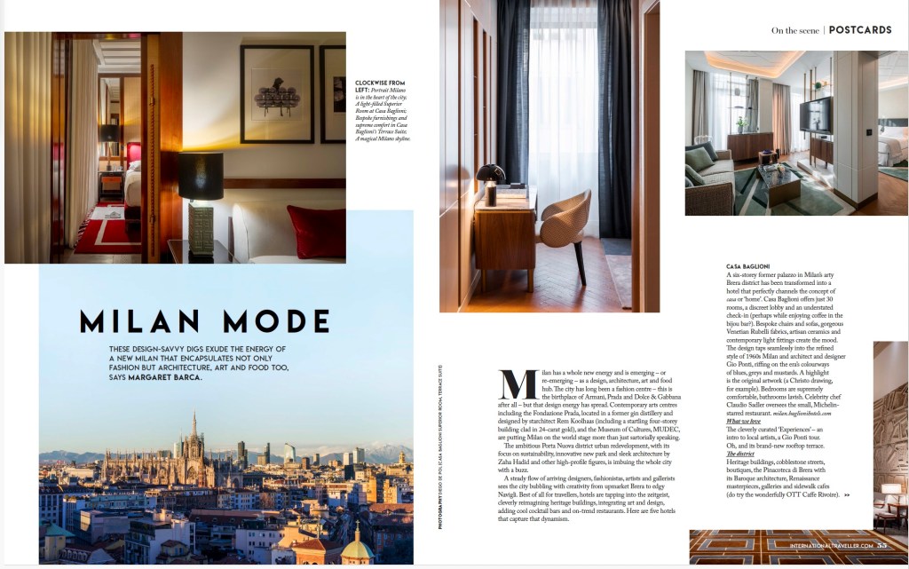 Milan’s pace-setting design and love of high fashion spills into its luxe hotels, with each welcoming guests in their own unique – and fabulous – way. Story in International Traveller magazine.