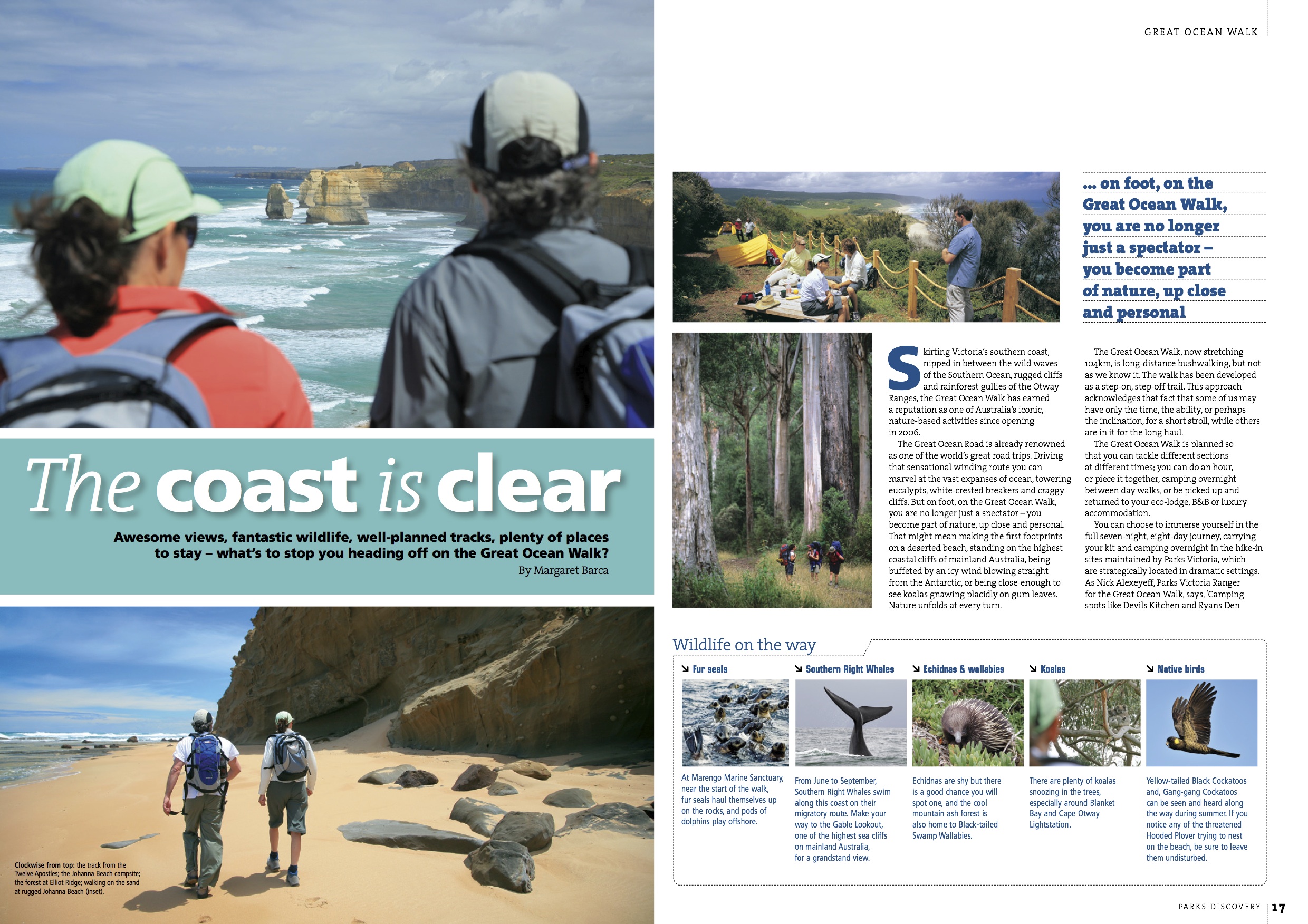 The coast is clear – a feature on one of Australia’s favourite coastal walks and drives, The Great Ocean Road, for Parks Discovery magazine.